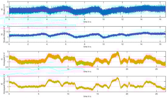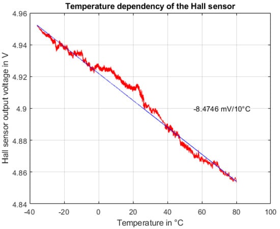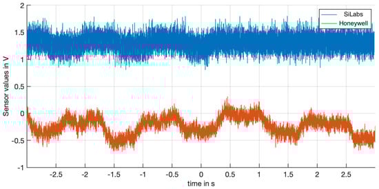 The Honeywell sensor delivers a ratiometric analog output centered between its supply voltage that can be chosen to lie between 6.6 to 12.6 , and clamped to the positive port. Additionally, it has a step response time (from 10 % to 90 %) of 3 and a linearity of % at max. in its linear operating range of . Due to the expected static magnetic field at the sensor positions of more than the sensor’s range, a different magnet with a weaker effective magnetic flux density of 0.607 was chosen for the first prototypes. The SiLabs sensor offers digital as well as analog outputs in an SOT-23 package. With a supply range of to 5.5 the supply circuit has to be adopted. The sensor’s sensitivity is half that of the Honeywell sensor at 125 VT−1.