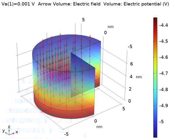 Simulation of the electric potential and electric field in a /Au Schottky diode. The image shows a three-dimensional representation of the electric potential profile (voltage) and the direction of the electric field (indicated by arrows) in a Schottky diode formed by a layer of molybdenum disulfide () and a gold contact (Au). Warm colors represent regions of higher electric potential, while cool colors indicate regions of lower potential. The interface between and Au presents a Schottky barrier, which is the depletion region where there is an abrupt drop in electric potential. The electric field is directed primarily from the region of higher potential (Au) to the region of lower potential (). The applied voltage here was 0.001 V.