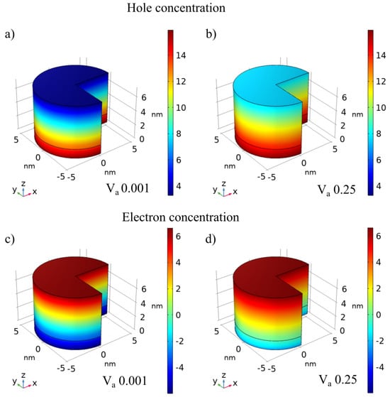 Carrier concentration in a /Au diode. The Au contact has a 6 nm thickness, and the layer is made of two atomic layers. The applied voltage () was introduced to the system at intervals of 0.001 V. In (a) the hole concentration at bias when 0.001 V is applied is shown, and in (b) the hole concentration when 0.25 V is applied is shown. In (c,d) are shown the electron concentration at 0.001 and 0.25 V, respectively.