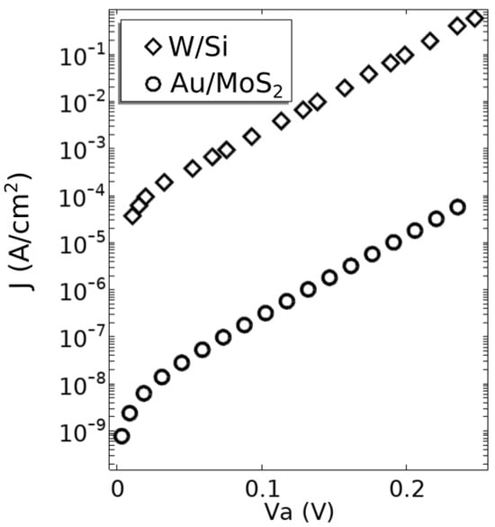 Comparison of the forward-bias I–V characteristics of two Schottky contacts: /Au and W/Si. The vertical axis represents current density (J) in A/, and the horizontal axis represents applied voltage (Va) in V [37].