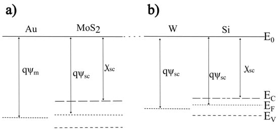 Schematic band diagram for each one of the isolated materials. In (a), we can find the band distribution of Au and . (b) depicts the W and Si band diagram with the following items: , the metal work function; , semiconductor work function; ; metal affinity; and , semiconductor affinity [38,39,40,41,42,43,44].