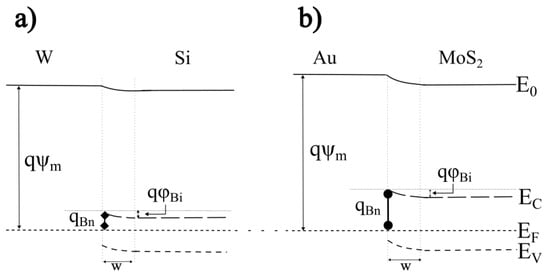 Figure 5 shows the proposed materials in isolation. It is aligned according to the vacuum level (). The Au work function (q) differs from that of (q), as shown in Figure 5a. In a similar way, Figure 5b depicts it for W and Si. This indicates that a mismatch exists in the Fermi level, and since q≠q in both cases, an electronic barrier will be formed in both devices.