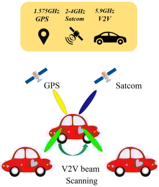 In recent years, with the rapid development of Internet of Things (IoT) technology, vehicular communication has become a hot topic. As shown in Figure 1, due to the increasing number of functions in vehicles, today’s vehicular communication scenarios have become more complex, including GPS communication, satellite communication, vehicle-to-vehicle communication, and more. These communication protocols correspond to different frequencies, and as a result, vehicles need to incorporate more communication links. In the face of such a multi-frequency communication environment, designing antennas that are cost-effective and compact while meeting communication scenario requirements is of utmost importance. Shared-aperture technology is a technology designed for multi-frequency applications. Compared with traditional antenna solutions, shared-aperture technology has a more compact structure, higher aperture utilization, uses a smaller area to achieve more functions, and has lower cost. It involves placing multiple antennas for different frequencies together while ensuring that they do not interfere with each other. Additionally, this technology can reduce the antenna’s footprint, thus lowering antenna costs [1,2,3,4,5,6,7].