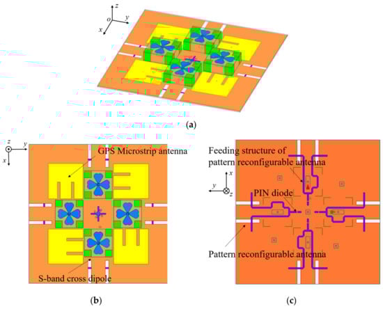 The basic structure of the proposed antenna is illustrated in Figure 2. It primarily consists of an E-shaped microstrip antenna, a cloverleaf-shaped circularly polarized cross-dipole antenna, and a pattern reconfigurable antenna with added PIN diodes. The antenna is designed with a two-layer substrate structure, both using Taconic RF35 (UNICONIC, Shenzhen, China) as the substrate material with a dielectric constant of 3.5 and a thickness of 1 mm. Additionally, the four cross-dipole circularly polarized antennas are affixed to the lower substrate structure with a metal framework, securely fastened using screws to ensure structural stability.