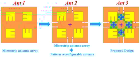 This design starts from the traditional rotating feed microstrip antenna, as shown in Ant 1 in Figure 3, by adding slot antennas around it, as shown in Ant 2, and adding a feed structure in the middle free area, introducing a pattern reconfigurable antenna. Through parameter adjustment, the antennas complement each other, and the directional pattern is not distorted. Finally, the dipole array is added. Due to the symmetrical structure, the axial ratio performance of the dipole array will not be significantly deteriorated. After parameter adjustment, a design model for the proposed three-frequency shared aperture is obtained.
