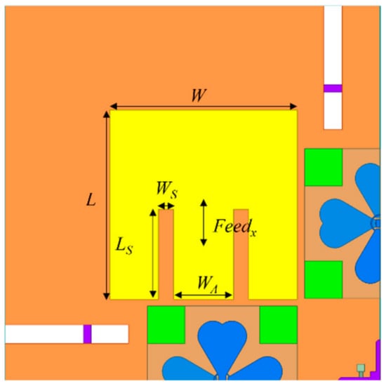A microstrip antenna for GPS applications is included in the proposed shared-aperture antenna. The working frequency of a conventional square microstrip antenna is determined by the length of the radiating edge of the patch. The design parameters of the square patch antenna can be calculated according to Formulas (1)–(4).