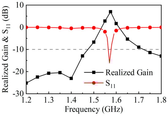 The use of a high dielectric constant and thin substrate can effectively improve the quality, so that the patch antenna has a narrower bandwidth. It can be understood that the medium with low dielectric constant has a weaker binding on electromagnetic energy, and the reduction in thickness also weakens the binding on electromagnetic energy in the structure, and the performance of the antenna is more selective in terms frequency. When designing GPS microstrip antennas, thinner substrates are used to design first-order high-quality narrow-band microstrip antennas. Figure 4 and Table 1 provide the specific dimensions of the microstrip antenna. According to Figure 5, the antenna has the effect of a filter antenna and has a radiation null at low frequency 1.4 GHz.