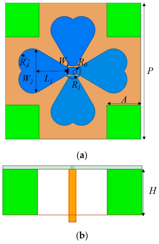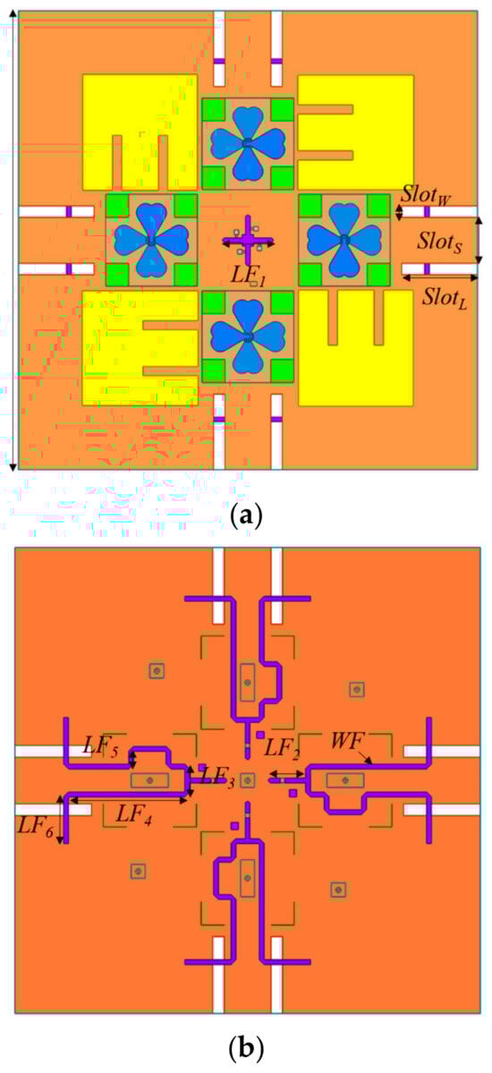 The circular polarization dipole structure adopts the shape of a clover, and the two polarized dipoles are connected by the circular phase shift line to realize the circular polarization characteristic of the antenna. The specific parameters of the antenna structure are provided in Figure 6 and Table 2. The substrate used is Taconic RF35 with a thickness of 1 mm.