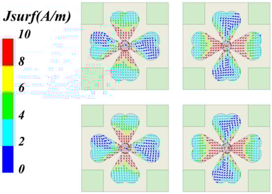 The current distribution of the antenna at 3 GHz is shown in Figure 8. When t = 0 and t = T/2, the current on the dipole arm is along the X axis, and when t = T/4 and t = 3T/4, the current on the dipole arm is along the Y axis, indicating that the antenna has good circular polarization characteristics.