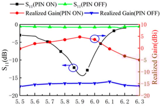 In the middle section of the feedline, four PIN diodes are used as switches to control the antenna’s radiation direction. The model of the PIN diodes is BAP70-03 (NXP, Eindhoven, Netherlands). Their equivalent circuit model is measured using the TRL calibration method, with the specific equivalent circuit shown in Figure 10. When the PIN diodes are in the open state, the on-state resistance is approximately 4.7 ohms. When they are in the off state, the off-state resistance is about 10,000 ohms. Additionally, the PIN diodes also introduce a series inductance of approximately 1.5 nH due to packaging. The gain and reflection coefficient of the reconfigurable antenna with a directional pattern are shown in Figure 11, which shows that the antenna has a certain filtering effect and can resist interference from other frequency antennas. In addition, when the PIN diode is turned off, the port of the antenna exhibits total reflection, indicating that the reconfigurable antenna has good selectivity.