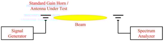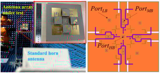 Based on the design process, a tri-band shared-aperture antenna covering the GPS L1 band, S-band, and 5.9 GHz V2V band was designed using ANSYS HFSS 2021. Subsequently, it was fabricated and measured. During the measurements, the S-parameters were obtained using a Keysight Network Analyzer N5244A (Keysight, Santa Rosa, CA, USA), and the antenna’s radiation pattern and gain were measured in an anechoic chamber. The prototype of the antenna, the testing environment, and the port definition are depicted in Figure 12. The antenna test architecture is shown in Figure 13. It mainly consists of a transmitter, a receiver, and a turntable. The transmitter includes a signal generator and a transmitting antenna, and the receiver includes a receiving antenna and a spectrum analyzer. The standard gain horn and the antenna under test are measured on the turntable separately, and the gain and pattern of the antenna under test can be calculated based on the power values received by the standard gain horn and the spectrum analyzer. In addition, the gain values of the standard gain horn at 1.5 GHz, 3 GHz, and 5.9 GHz are 9 dBi, 12 dBi, and 14.5 dBi, respectively.