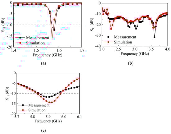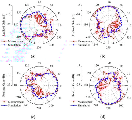 The antenna’s port-matching performance is displayed in Figure 14, and upon comparison, we can observe that the measured reflection coefficient closely aligns with the simulation. The microstrip antenna for GPS covers the commonly used L1 band (1575.42 ± 1.023 MHz), the impedance bandwidth of the S-band cross-dipole circularly polarized antenna is approximately 53.3% (2.2–3.8 GHz), and the pattern reconfigurable antenna’s operational bandwidth is sufficient to meet the application requirements of V2V (5.855–5.925 GHz).