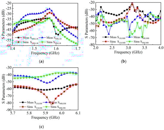 Simulated and measured iso-frequency port isolation at (a) GPS L1 band; (b) S band; (c) V2V band.