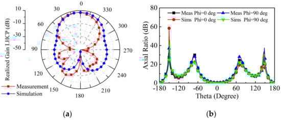 Radiation performance of microstrip antenna. (a) Radiation pattern; (b) axial ratio.
