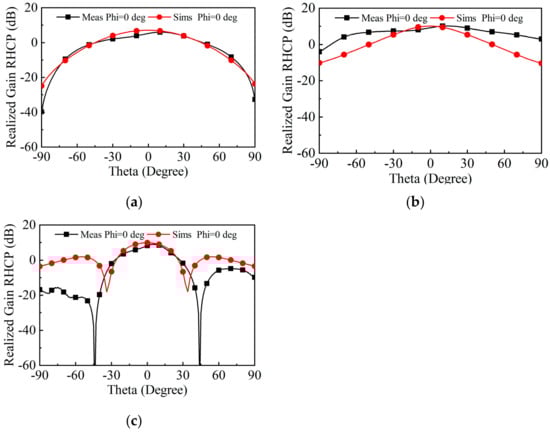 Simulated and measured reflection coefficient of (a) microstrip antenna; (b) cross-dipole antenna; (c) pattern reconfigurable antenna.