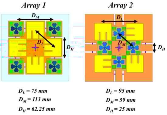 To be specific, the distribution of antenna elements is very important to ensure that the antenna does not have grating lobes. Therefore, two antenna distributions are designed and simulated, as shown in Figure 19. Both antennas can achieve the characteristic of three-frequency shared aperture, but there is a significant difference in the array spacing. The spacing between the S-band antenna elements and the 5.9 GHz antenna elements in Array 1 exceeds the full wavelength, which is prone to grating lobes. However, the antenna distribution in Array 2 fully considers the array spacing, and the unit spacing is less than half a wavelength, so that the small array can achieve the effect of not scanning out the grating lobe.