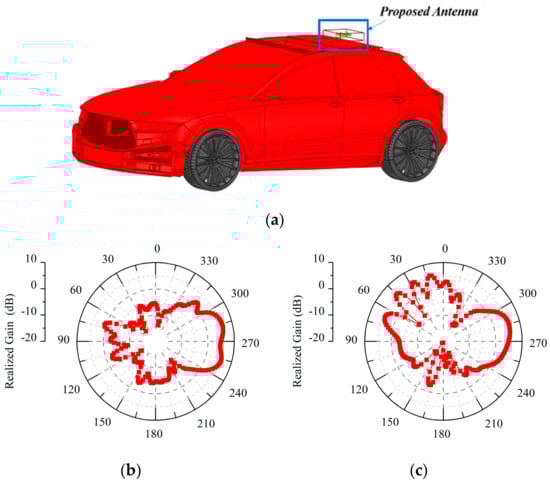 (a) The schematic diagram of antenna installation on a car. (b) Horizontal radiation pattern of pattern reconfigurable antenna. (c) Vertical radiation pattern of pattern reconfigurable antenna.