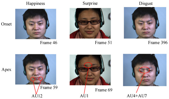 The SMIC [40] dataset comprises 164 microexpression videos captured from 16 participants, with videos recorded at a frame rate of 100 fps and a resolution of 640 × 480 pixels. The microexpressions are categorized into three simplified emotional labels: “Positive”, “Negative”, and “Surprise”.