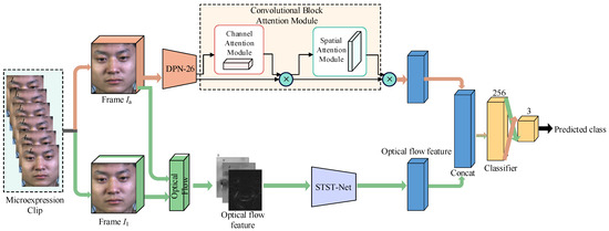 The ADP-DSTN network architecture comprises three primary components: (1) the first is the facial feature extraction branch, which utilizes DPN-26 as the core framework and integrates the Convolutional Block Attention Module (CBAM) to optimize the structure for facial feature extraction. (2) The optical flow feature extraction branch is designed to extract optical flow and optical strain from each microexpression segment, encompassing the transition from the initial frame to the peak frame, thereby capturing the dynamic changes in the microexpression. Subsequently, the horizontal optical flow, vertical optical flow, and optical strain are input into STSTNet for feature extraction, facilitating a comprehensive understanding of the complexities of facial expressions. (3) The third branch involves the fusion of features extracted from both the facial and optical flow branches, followed by the classification of microexpressions for recognition. The overall network model framework is illustrated in Figure 2.