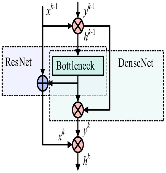 During the iterative training of the DPN, the output from the final convolutional layer within the Bottleneck structure is strategically divided into several parts. One portion of the output is directed toward the ResNet pathway, where the ResNeXt architecture, a variant of ResNet designed to improve the learning efficiency of each micro-block, is utilized. Simultaneously, another portion is routed to the DenseNet pathway. Before transitioning to the next micro-block, the feature matrices from these two distinct pathways are merged, facilitating comprehensive feature extraction. This cyclical mechanism not only allows the network to thoroughly explore new features but also maintains high flexibility while integrating the strengths of both architectures. The structure of the micro-block network is illustrated in Figure 4.