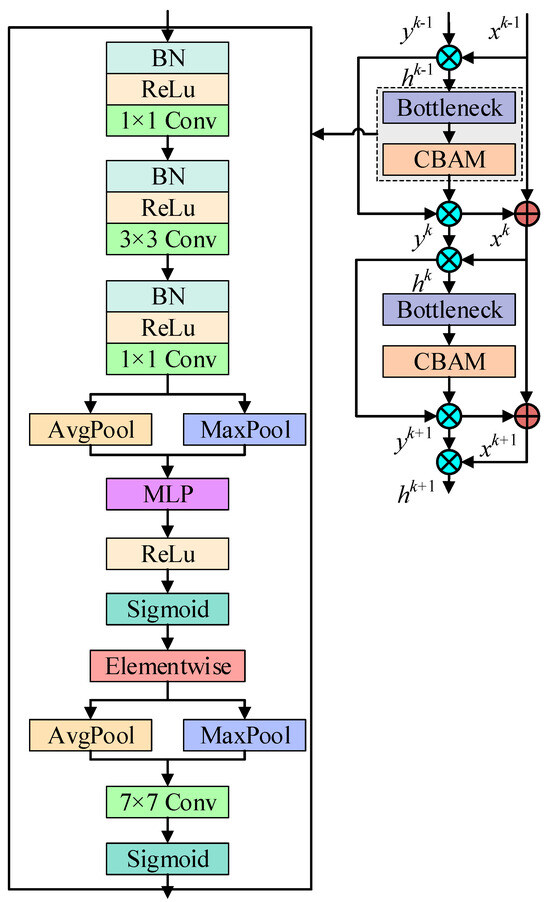 In Figure 5, represents the feature map output from the layer, which is the non-linear feature obtained after the convolutional transformation of the previous micro-block. This feature map, , undergoes processing through the Bottleneck layer and the CBAM module. The detailed computational process can be expressed using Equations (4)–(7):
