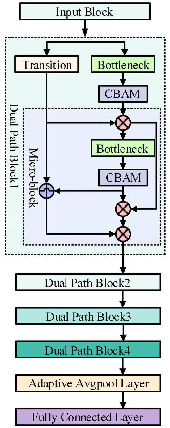 The Dual Path Network (DPN) is a hybrid architecture that combines the strengths of DenseNet and ResNet. The network structure combines ResNet’s efficient capabilities in feature extraction refinement and reuse and DenseNet’s expertise in digging deeper into the details of new features. Through its internal, tightly interwoven, dual-channel connections, this design significantly mitigates the gradient vanishing challenges that deep networks may encounter during training, while reducing the number of parameters and maintaining high computational efficiency. The DPN contains multiple micro-block modules, and each micro-block utilizes a 1 × 1, 3 × 3, and 1 × 1 Bottleneck design. This design constructs a network structure with dual paths by sharing information between the Bottleneck layers of DenseNet and ResNet.