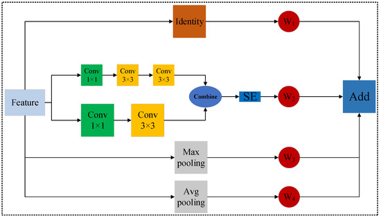 In Equation (8), the term “Combine” represents the concatenation function. The symbols , , and correspond to the 1 × 1, 3 × 3, and 5 × 5 convolution operations, respectively, while denotes the input feature map.