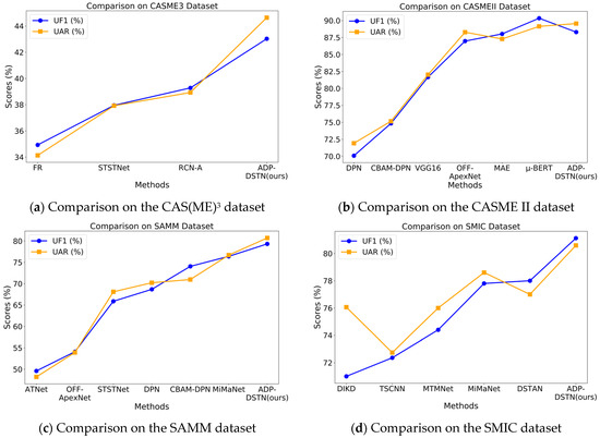 The proposed ADP-DSTN method achieved significant performance improvements over prior and baseline approaches. As illustrated in Table 3 for the CAS(ME)3 dataset, experiments conducted with three, four, and seven emotion classification categories showed that the ADP-DSTN consistently outperformed the compared methods. Specifically, for three emotion categories, the ADP-DSTN attained a UF1 score of 43.03% and a UAR of 44.64%, compared to the UF1 scores of 34.93% and 39.28%, and the UAR scores of 34.13% and 38.93% for the FR and RCN-A methods [47], respectively. When considering four emotion categories, the ADP-DSTN exceeded the baseline (+Depth) [37] by 6.38% in UF1 and by 8.59% in the UAR. For the seven emotion categories, the ADP-DSTN achieved UF1 and UAR scores of 25.39% and 27.48%, respectively, outperforming the baseline scores of 17.73% and 18.29%.