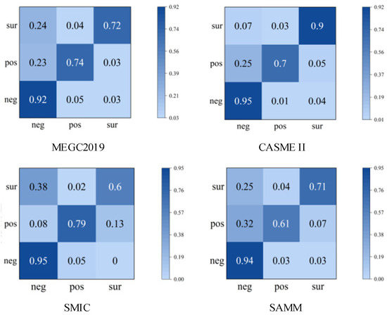 In comparison to Experiment 2, the results from Experiment 3, which utilized our improved network, were superior. This enhancement was primarily due to the introduction of a convolutional attention mechanism, underscoring the mechanism’s effectiveness in microexpression learning. Furthermore, Experiment 1 outperformed Experiment 3, highlighting that optical flow features offer superior feature representation within convolutional neural networks compared to raw image data, especially in the extraction of subtle facial actions like microexpressions. Among all approaches, Experiment 4, which integrated optical flow features with facial feature extraction networks, demonstrated the best performance, with the UF1 and UAR achieving the highest scores across all datasets. This outcome validates the feasibility and effectiveness of our feature fusion approach for microexpression recognition.