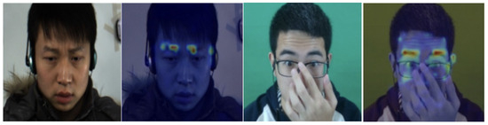 Class Activation Mapping (CAM) was employed to further analyze the feature focus regions of the improved model, as depicted in Figure 10. The left panel shows the original image, while the right panel displays the corresponding feature map. For instance, in the “negative” microexpression, the critical features were predominantly concentrated above the subject’s eyebrows. The network model effectively captured these emotional cues, with its attention precisely aligned with expected regions, notably the “brow” and “eye” areas of the face. This finding demonstrates that the incorporation of the attention mechanism into the network’s optimization effectively targeted key facial areas, thereby improving recognition accuracy.