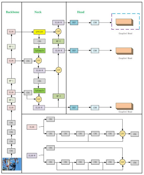 Considering the complex environment of the power operation scene and the existence of power facilities with different forms of interference and other problems, this paper applies a deep learning network to the recognition of safety belt hook state to realize the automatic recognition of hook state in complex power operation scenes. The network takes YOLOv7 as the base network, designs the M-SPPCSPC module to enhance the speed of the backbone network, and references the decoupling header [32]. Separate implementation of confidence and regression frames improves network detection accuracy and accelerates network convergence. Finally, the WIoU [33]-invoked loss function, based on an intelligent gradient gain allocation strategy, can focus on anchor frames of common quality and improve the overall performance of the detection network. Meanwhile, in an effort to evaluate the effect of the improved model, experimental validation is carried out on the Hook Dataset. The structure of the improved YOLOv7 network is shown in Figure 2.