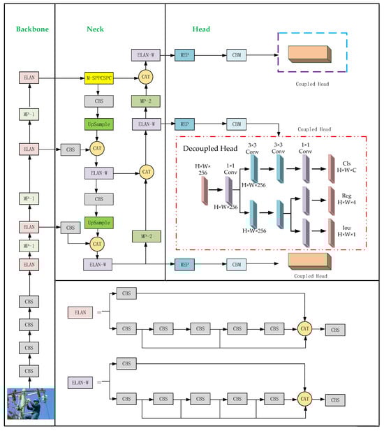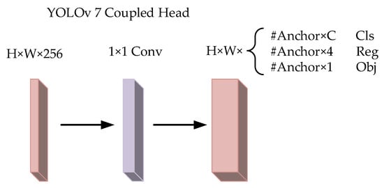 The backbone and feature pyramid of the YOLO series, such as Feature Pyramid Network (FPN) and Path Aggregation Network (PAN), have undergone much optimization and evolution, though the YOLO series detection head part still adopts a coupled design. Furthermore, YOLOv7 continues this feature, its detection head is still a coupled head, and the coupling head changes the position of the boundary box. The confidence and class probabilities are accomplished by a 1 × 1 convolution, as shown in Figure 5.