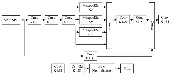 SPPCSPC is a feature extraction module in YOLOv7 that is composed of SPP and CSPNet structures. In other words, the SPP module is first used to extract features and then input them into CSPNet. Pooling of input feature maps of different sizes and scales can be carried out to further improve the accuracy and speed of the model. The structure of SPPCSPC is shown in Figure 3. In the first branch of Figure 3, there are four branches for parallel MaxPool processing. The MaxPool window sizes are 5, 9, 13, and 1. Nevertheless, the four MaxPools are processed in parallel, and the overall processing speed of the module is slow.