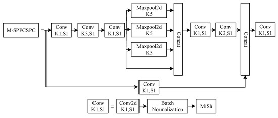 The M-SPPCSPC module serially passes inputs through multiple 5 × 5-sized MaxPool layers, an operation that reduces the amount of computation and achieves the same outputs while maintaining the same sense field.