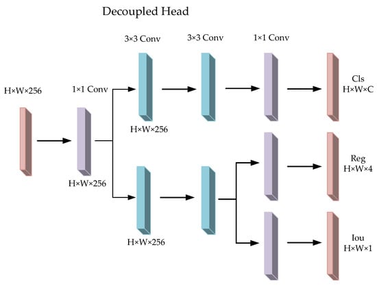 For the input feature layer, the decoupling head will use 1 × 1 convolution to downscale it to reduce the amount of computation and the number of parameters, then use two 3 × 3 convolutions in each of the two branches, classification and regression, to extract the features that help to identify the target category and the features that predict the bounding box coordinates. The decoupling network can obtain three outputs: classification (Cls), regression (Reg), and objectness (Obj), where Cls is the corresponding type of the target frame, Reg is the position information of the target frame, and Obj is whether each feature point contains an object. The three output values are fused to obtain the final prediction information. The decoupling operation implements the confidence and regression frames separately, which slightly increases the complexity of the process, but alleviates the negative impact of the conflict between the classification and regression tasks [34,35], thus achieving the goal of improving the network detection accuracy, as well as accelerating the convergence of network training.