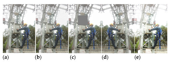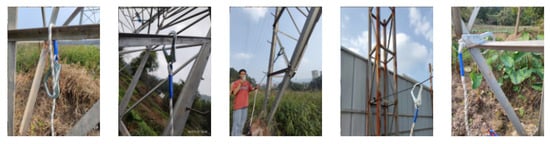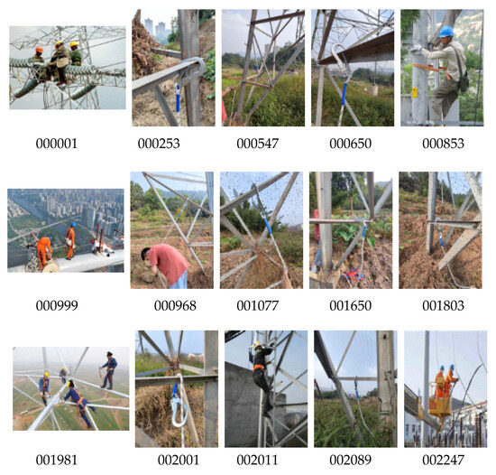 The power operation safety belt dataset used in this study comes from the training materials of power companies, safety monitoring cameras, and field shots. Among them, the Hook Dataset is mainly composed of the power tower operation site photographed in the field and data collected by a web crawler, which both cover all kinds of electric power operation scenarios, including different working environments, lighting conditions, electric power equipment, etc., which show the use of safety belts in high and low hanging positions from various angles, covering the various suspension methods of the safety belt hooks, and the labels are categorized into five types: four types of violations (wrong place, wrong tie, too thin, and not closed) and one type of safety (safe). The sample images of the dataset are shown in Figure 8.