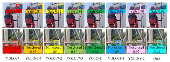 As can be seen from Table 4, for mAP@0.5, the improved algorithm proposed in this paper reaches 81.2%, which is 2% higher than that of YOLOv8-2 and 7.4% higher than that of the original YOLOv7, indicating that the improved algorithm significantly improved the overall detection performance, which proves that WIoU can improve the accuracy of reasoning. For all types of AP, the improved algorithm performs well in all categories, especially in the “Wrong place” and “Not closed” categories, reaching 82.0% and 82.5%, respectively, far exceeding other models. In addition, although YOLOv8 and its variants are improved compared to YOLOv7, the improved algorithm in this paper still performs better. For example, at mAP@0.5, the improved algorithm is 2% higher than YOLOv8-2 and 5.5% higher in the “Wrong place” category. The improved algorithm proposed in this paper is superior to YOLOv7, YOLOv8, and their variants in various indicators, which proves that the improved method based on YOLOv7 proposed in this paper makes a meaningful improvement in the detection effect of seat belt hooks, showing significant performance improvement and better generalization ability. In order to more intuitively display the test effect of the suspension mode of the seat belt hook before and after the improvement, the test results are visualized, as shown in Figure 3, Figure 4, Figure 5, Figure 6, Figure 7, Figure 8 and Figure 9. For the purpose of more intuitively showing the detection effect of the seat belt hook suspension method before and after the improvement, the detection results are visualized, as shown in Figure 12.