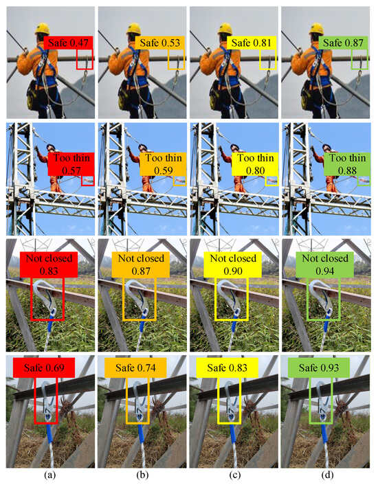 Analysis of the table shows that 3.2% of false positives misidentify shadows as hooks, possibly due to changes in lighting conditions. For false negatives, 2.8% of errors were failures to detect partially occluded hooks, indicating that the model has room for improvement in handling occluded situations. In addition, in terms of misclassification: 4.5% of errors misclassified “too thin” hooks as “not closed”, which may be due to the visual similarity of the two states at certain angles. When it comes to bounding box inaccuracies, 5.1% of errors were the bounding boxes of large hooks that are outside the image range, which may require improvements in the model’s ability to handle large objects. Overall, despite the excellent overall performance of our model, there are still some areas for improvement, especially in dealing with occlusion, lighting variations, and large objects, for which future research can be optimized.