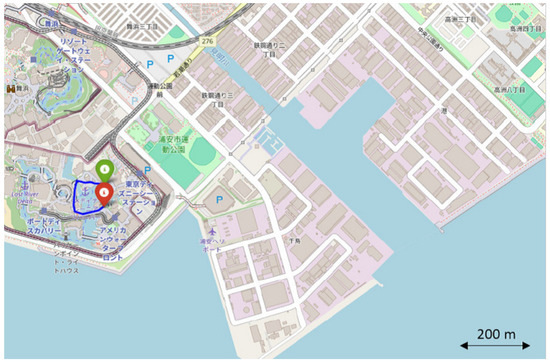 For example, Figure 1 shows one person’s movement trajectory through Urayasu City, Chiba Prefecture, on 27 August 2022, where the start and end points are indicated by red and green markers (the latter is hidden behind the former). This is a typical example of what can be observed in a moving trajectory, where its area bounded is 28.2 km2 and its perimeter is 200.4 km. Figure 2 shows another person’s movement path through Urayasu City on 22 August 2022. This is another typical movement trajectory on a small scale, although it is overlooked when superimposed on Figure 1 due to the scale, which is an enclosed area of 0.033 km2, whose outer perimeter is 0.70 km. This paper focuses on whether the properties observed in Urayasu City can also be observed in data from Shimogyo-ku and Ishikawa Prefecture. In particular, we discuss what fuels the changing nature of long-distance travel on weekends and national holidays.