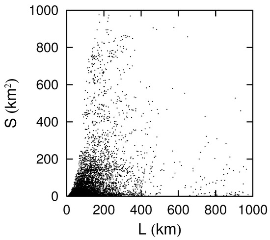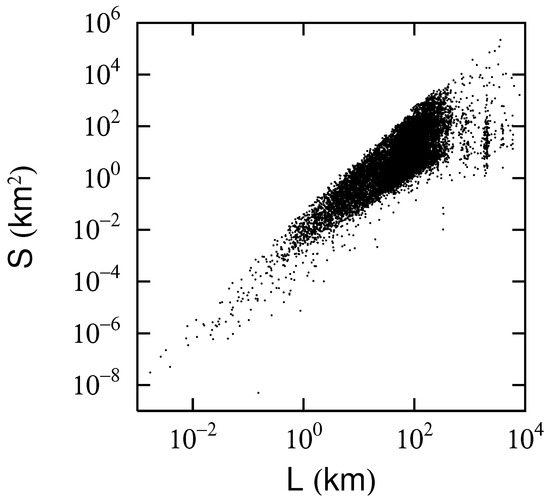Figure 3 also shows that the data are widely distributed, although many are gathered in km and km2. To see the structure in more detail, we plot Figure 3 on both of the logarithmic axes and denote it as Figure 4. It shows a strong correlation between and , which can be expressed using parameter :