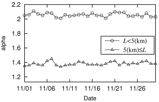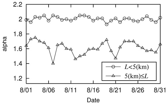 Furthermore, Figure 4 shows that parameter in Equation (1) is different for large (long distance) and small (short distance) scales of L. In this paper, we denote km as a short distance and its parameter as and 5 km as a long distance and its parameter as . The boundary between short and long distances, 5 km, was set as the distance an average adult might walk in approximately one hour.