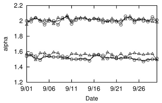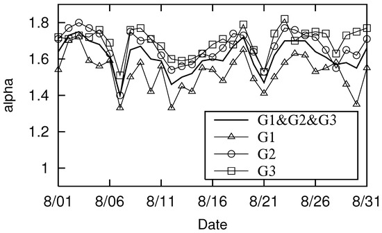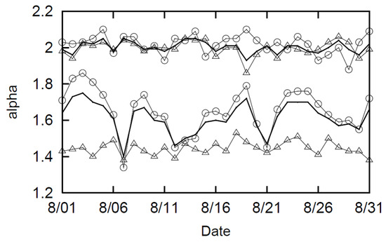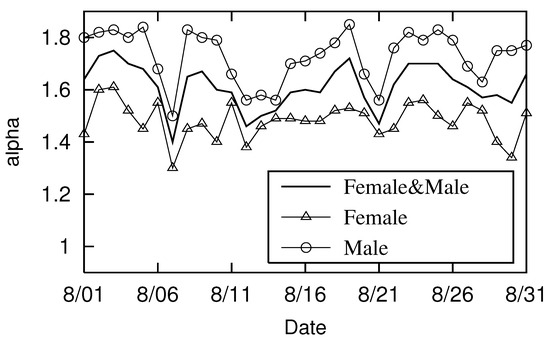 Next we measure parameters and for every person who passed through Urayasu City during the 31 days of August and represent these changes in Figure 5. We removed the errors (to two decimal places) for clarity. There are four minima in (△), shown in Figure 5: August 7, 12, 21, and 30. August 7 and 21 are Sundays, the 12th is the second day of a period of summer holidays in Japan, and the 30th is just before the end of the children’s summer vacation. The above observation indicates that people’s long-distance movement trajectories are more linear on weekends and holidays.