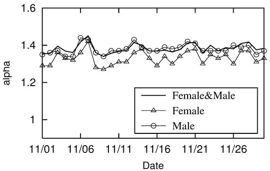 We next observed the movement trajectories classified by personal attributes. First, we note whether any differences surface by gender in long-distance movement trajectory parameter . Figure 6 shows the transition for women (△) and men (◯). At the same time, the transition for the case without a gender distinction is also denoted by a solid line (–), which is identical to the (△) transition in Figure 5. Figure 6 shows that the of women is always smaller than that of men, an observation that implies that long-distance movement trajectories are more linear for women than men.