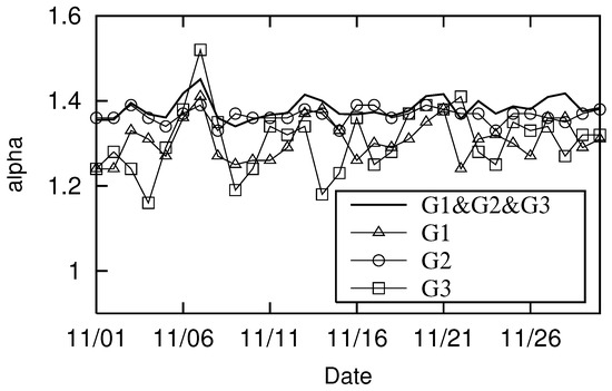 Next, we examined whether long-distance movement parameter differed by age group (as in Urayasu City) by again classifying the people into the same three age groups: under 30, between 30 and 60, and over 60 (denoted as G1, G2, and G3, respectively). Figure 10 shows the trends by the three age groups. The transition when age is not distinguished is also marked with a solid line (–), identical to the (△) in Figure 8 and the (–) transition in Figure 9. Figure 10 shows that in the case of Kyoto City, unlike Urayasu City, no significant differences are found in the shape of the long-distance movement trajectories by age group. Similar results to the above are observed in the movement trajectory of those who passed through Shimogyo-ku, Kyoto in January 2022.