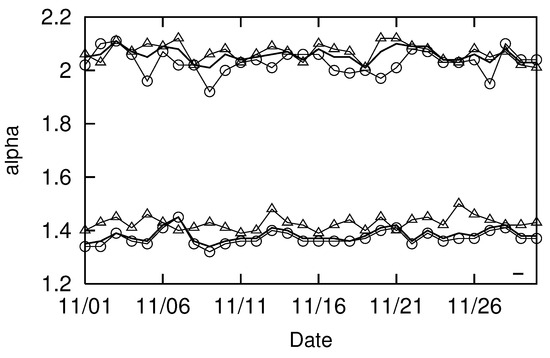 Figure 8 shows the (◯) and (△) of people passing through Shimogyo-ku, Kyoto, during the 30 days of November 2021. In Figure 8, as in Figure 5, the second decimal place errors were omitted for clarity. In Figure 8, (◯) remains close to 2, as in Figure 5, which shows the movement trajectory of Urayasu City. At the same time, (△) falls between 1 and 2. However, the difference is that fluctuated around in the case of Urayasu City, whereas it fluctuated around for Shimogyo-ku. The major difference is that the linearity of the long-distance movement trajectory in Urayasu City is strengthened on weekends and national holidays ( becomes smaller), and it weakens in Shimogyo-ku ( becomes larger). Specifically, in Figure 8 has six maxima: November 3, 7, 13, 21, 23, and 28. These are all weekends or holidays (November 7, 14, 21, and 28 are Sundays; November 3 and 23 are national holidays). Similar results to the above can be found in the movement trajectory of those passing through Shimogyo-ku in January 2022.