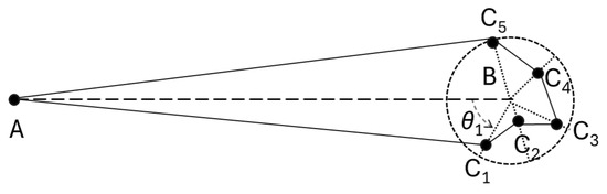 First, consider a circle whose radius is centered at point B at distance R from point A (Figure 14). Take n points on its circumference. Denote by angle , which makes a line connecting them and the circle’s center B, where . Consider point on each line whose distance from point B is . Figure 14 is an example for . Next, R is generated 20,000 times with a power distribution of exponent 1 and and are uniformly distributed. Then, deeming point A as home and point as a destination, we investigate the movement trajectory that connects A → → → ⋯ → → A, and measure area S that encloses it and its perimeter L. Figure 15 is a scatter plot of L and S with .