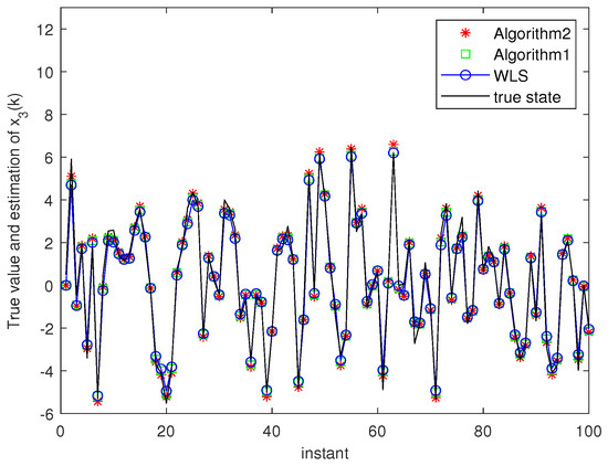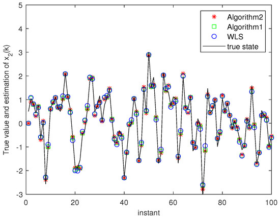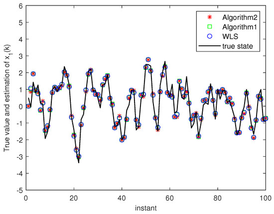 Algorithm 1 and Algorithm 2 are compared with the state estimation based on the weighted least squares method (WLS) through numerical example. We consider two example described by Systems (1)–(2).