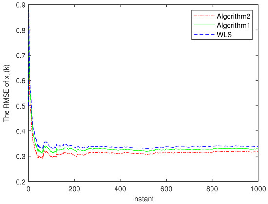 Figure 4. The RMSEs of two algorithms for x 1 ( k ) .