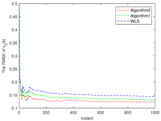 Figure 5. The RMSEs of two algorithms for x 2 ( k ) .