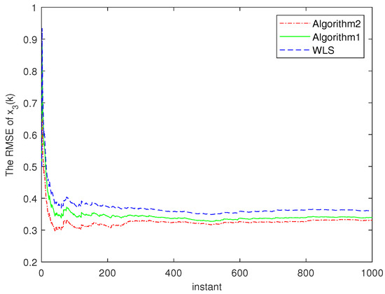 Figure 6. The RMSEs of two algorithms for x 3 ( k ) .